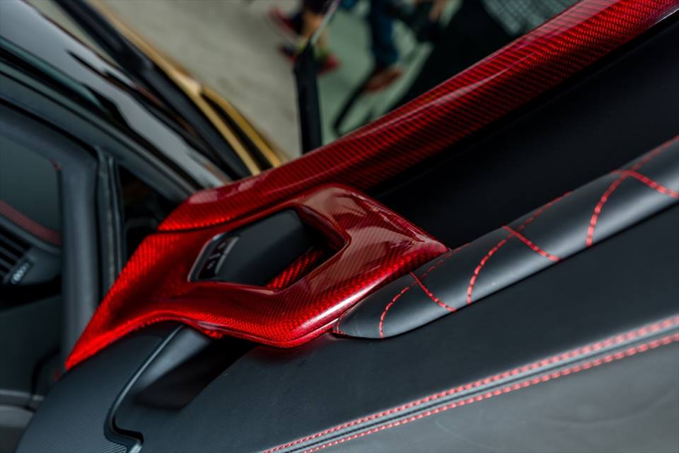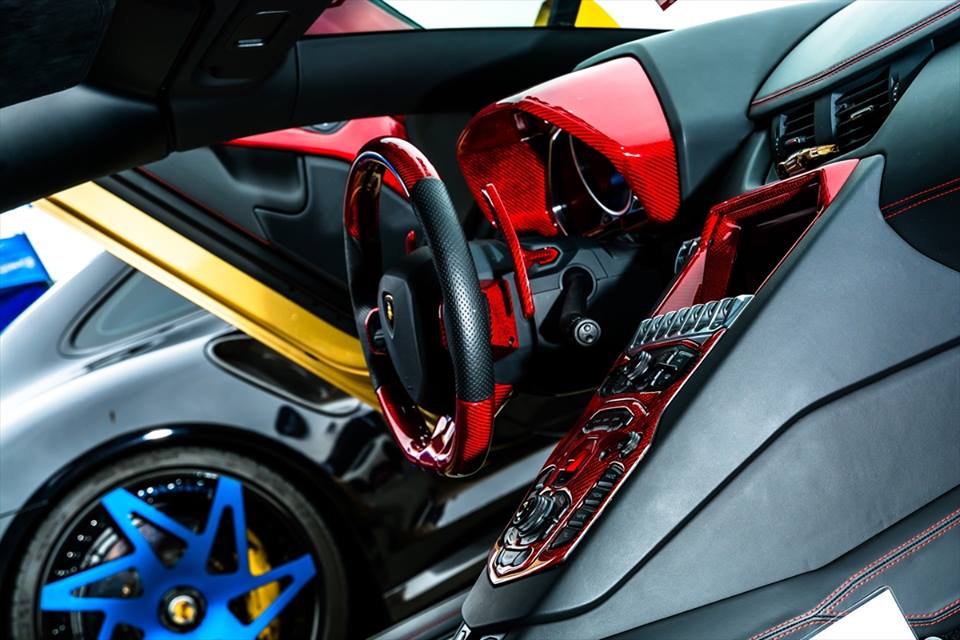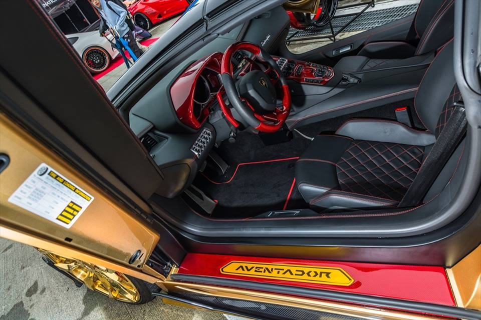 Naturally, the car gets a set of golden Forgiato wheels because no other brand creates rims so mad. One would think the gold theme continues inside the car as well, but there you will find carbon fiber trims finished in candy apple red. Yep, this is the maddest Lamborghini Aventador in the world!