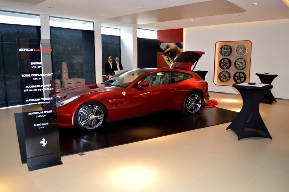 So the new Ferrari GTC4 Lusso, the replacement for the FF, is starting to reach the showrooms around the world. And we get our first glimpse of the car in the flesh at the car maker’s showroom in Cannes where a red examples is awaiting its buyer.