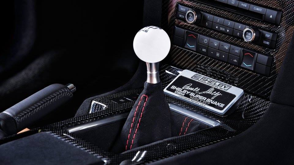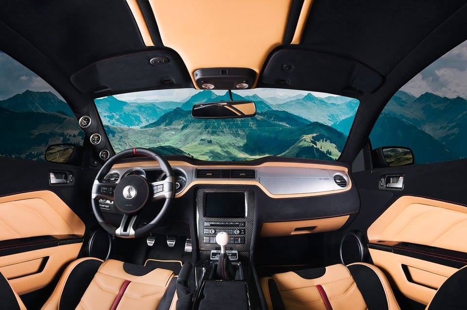The main ingredients of Vilner Shelby Mustang GT500 Super Snake interior package include Beige leather, black Alcantara and glossy lacquered carbon. Together, and with red stitching and embroidery, they cover every single surface of the cabin except for the silver panels of the dashboard. The tuner has taken care to cover even the steering column, transmission tunnel and parts of the seats and door cars normally obscured from view in the fine material.