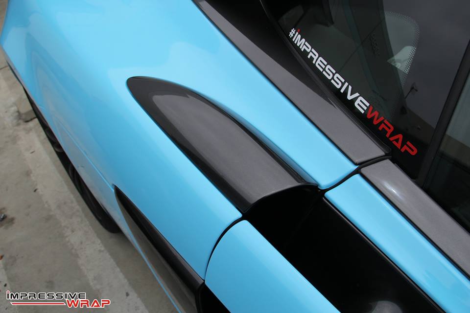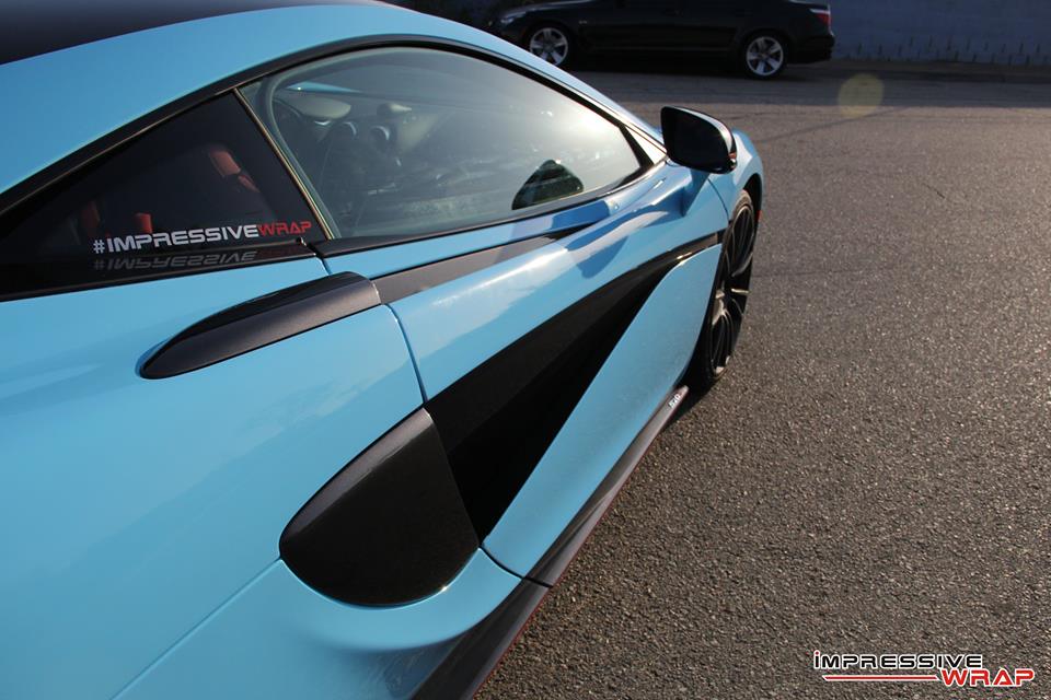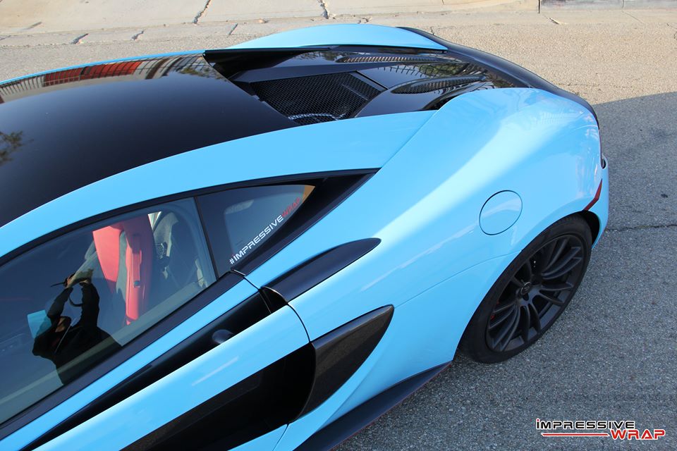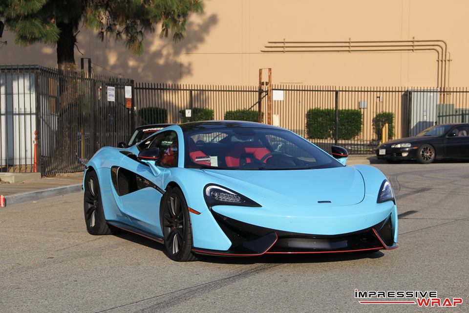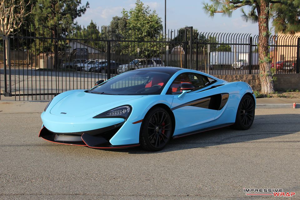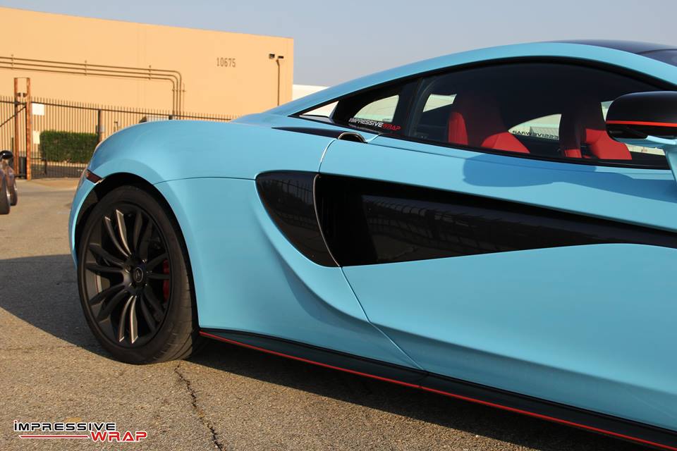 Wrapped by Impressive Wrap, this Sky Blue McLaren 570S features a cool glossy finish that looks its best under direct sunlight. On this car the sky blue – also known as baby blue – is complemented with stock black accents of the McLaren and some subtle red detailing which is really nice. Blacked-out roof and wheels, red brake calipers, and a red interior are among the other notable highlights of this car.
