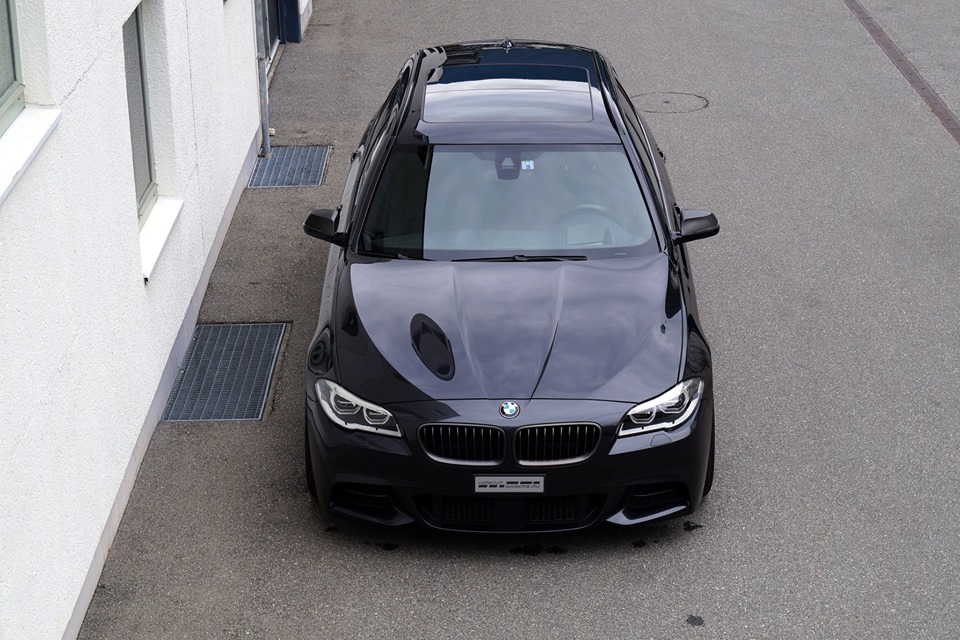 What we have here is a car that has all the good parts of the regular M550d, but with enhanced styling and power brought on through the use of very fine aftermarket components. Cartech BMW M550d is finished in metallic black with all the chrome parts on the exterior painted a foggy black to match the wheels.