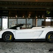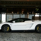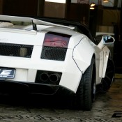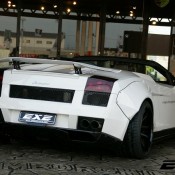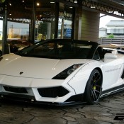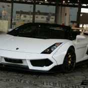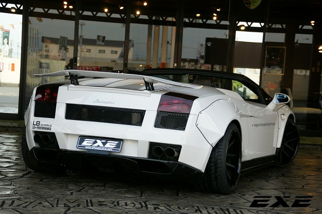 The body kit on this custom Lamborghini Gallardo Spyder by EXE consists of the usual LB-Works elements including bolt on fenders on the front and rear complete with sills and custom bumpers, but it also features a unique aero kit with front and rear spoilers and diffuser. The car also boasts a lift kit system, 19 inch Rotiform wheels, Kreissieg adjustable exhaust system and a power kit for an extra ten or so horsepower.