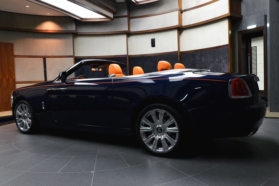 Charles Rolls and Henry Royce probably never envisioned, when they put together Rolls-Royce Motor Cars, that someday their names would be on a navy blue four-seat convertible with an orange interior. But that’s what the company’s Bespoke department does these days, and someone in Abu Dhabi has ordered a Rolls-Royce Dawn in just this configuration.