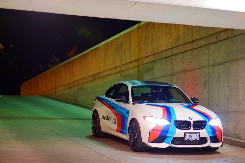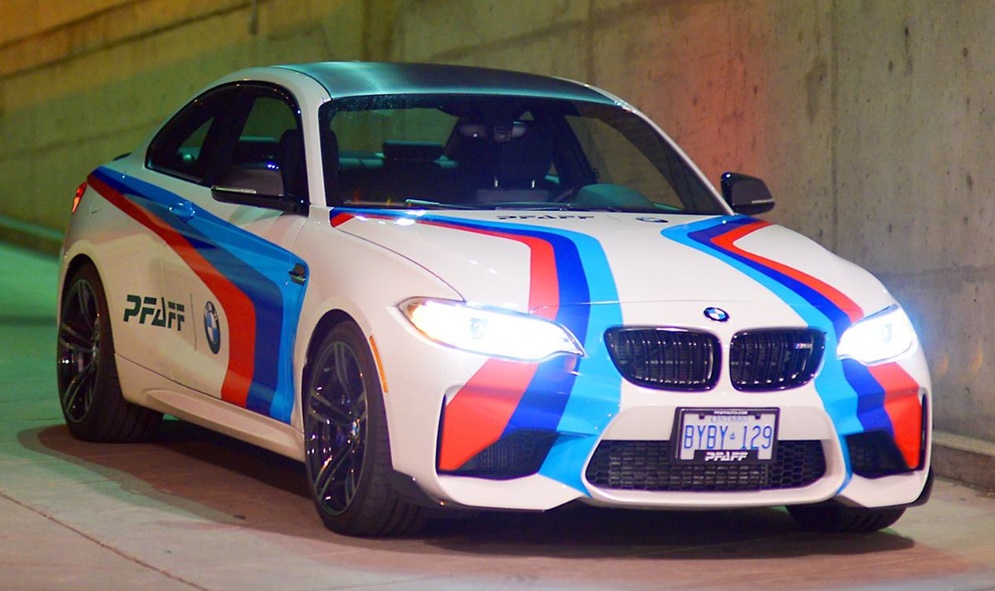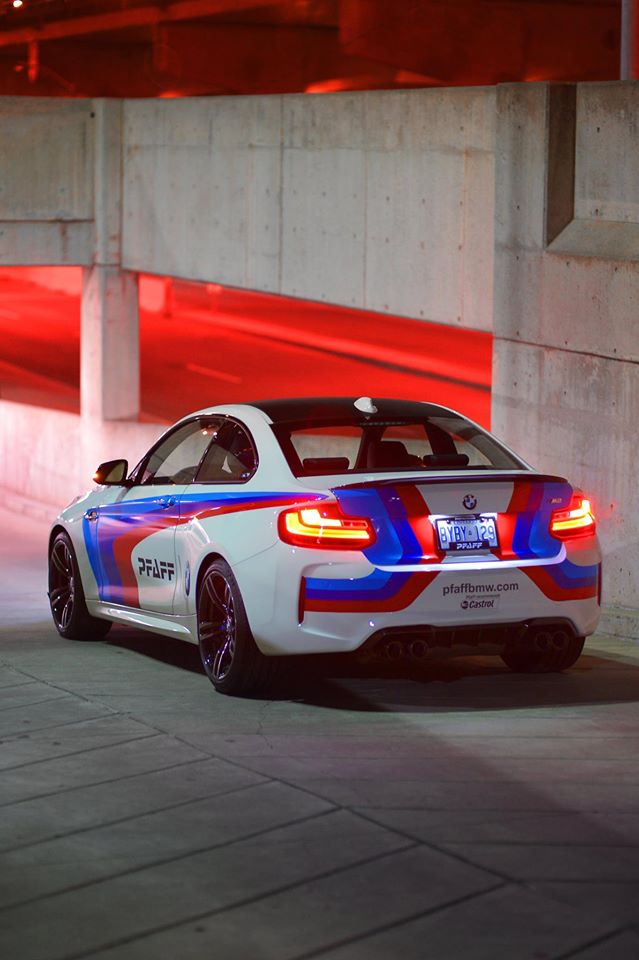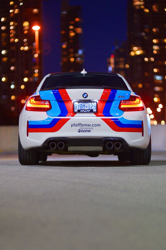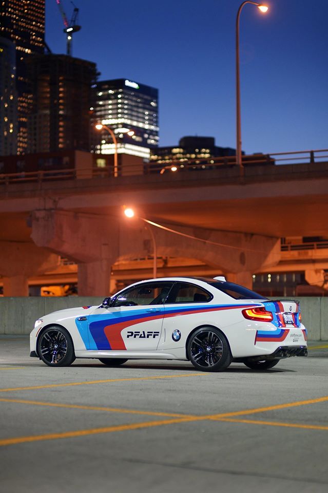 The M Performance catalog for the BMW M2 is full of good stuff like carbon fiber aero kit, sport exhaust system, gloss black exterior trim, Alcantara interior trim, and… but one option they offer, as showcased here in these nice photos by Pfaff BMW, is a full M racing color livery. You can actually order this for your road car, and I think we even had a video about it some time ago. So there you go, if you think this is cool and you want to get it… well, it’s sign you might have a mild case of dorkism!