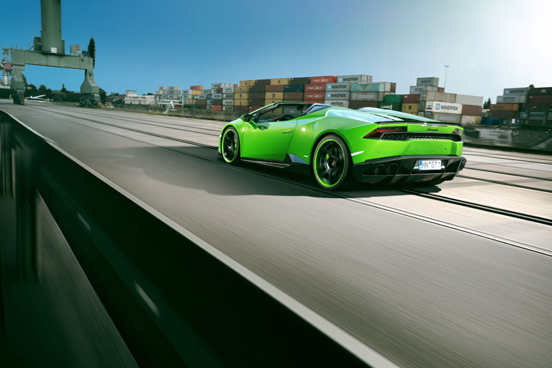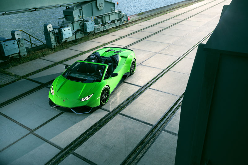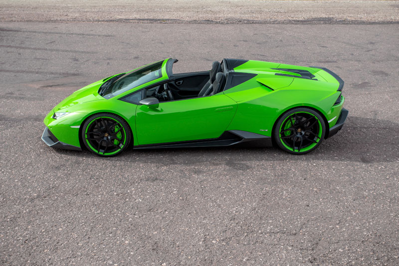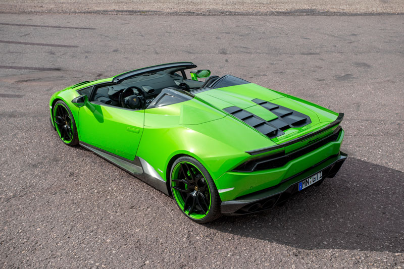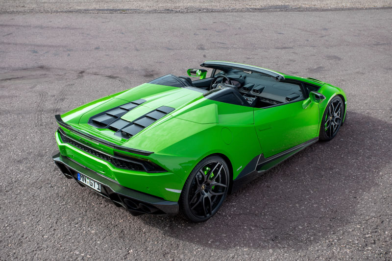 Novitec Lamborghini Huracan Spyder, shown here in Verde Mantis, comes with a carbon fiber aero kit consisting of front spoiler lip and struts, custom side skirts and mirror caps, a new carbon engine cover, rear diffuser with pronounced fins, and a neat boot lid spoiler, also in carbon. You also find the bits above the roll hoops are also finished in carbon, and that the kit is complemented with a set of Novitec wheels measuring 20” up front and 21” out back.