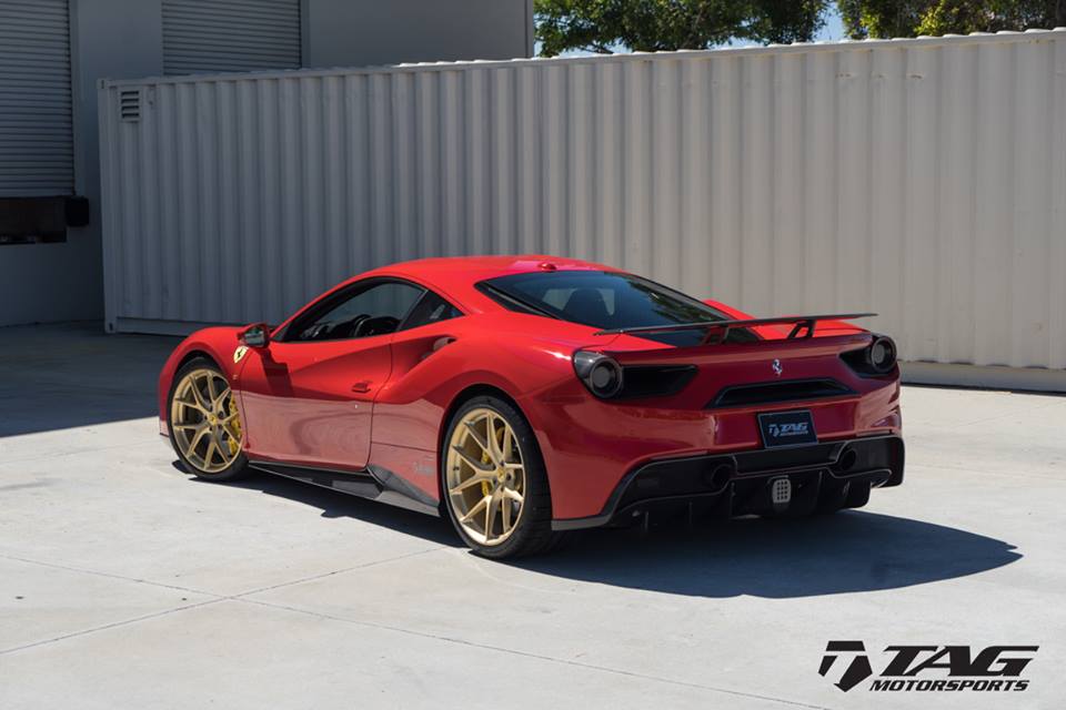 The ingredients of TAG Motorsports Novitec Ferrari 488 GTB is as follows: HRE Performance Wheels P101 Wheels in Frozen Gold Finish (Brushed Matte Gold) 20″ Front 21″ Rear – 245/35/20 & 355/25/21 Pirelli PZero Tires – NOVITEC GROUP Carbon Front Lip Spoiler – Novitec Carbon Lower Front Wings – Novitec Carbon Side Panel Set (side skirts) – Novitec Carbon Rear Diffusor – Novitec Carbon Diffusor Add-On – Novitec Carbon Diffuser Fins – Novitec Carbon 3rd Brake Light – Novitec Carbon DRS Aero spoilers (rear lower 3 pieces) – Novitec Carbon Rear Air Outlets – Novitec Carbon Center Air Outlet – Novitec Carbon Rear Wing – Novitec Carbon Mirror Set – Novitec Carbon Door Triangles – Novitec Carbon Tailight Covers – Novitec Sport Spring Set – Novitec Non-Valved Exhaust System – Novitec Cat Delete Pipes – Novitec Techtronic Unit – Novitec Noselift Kit.