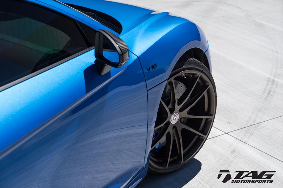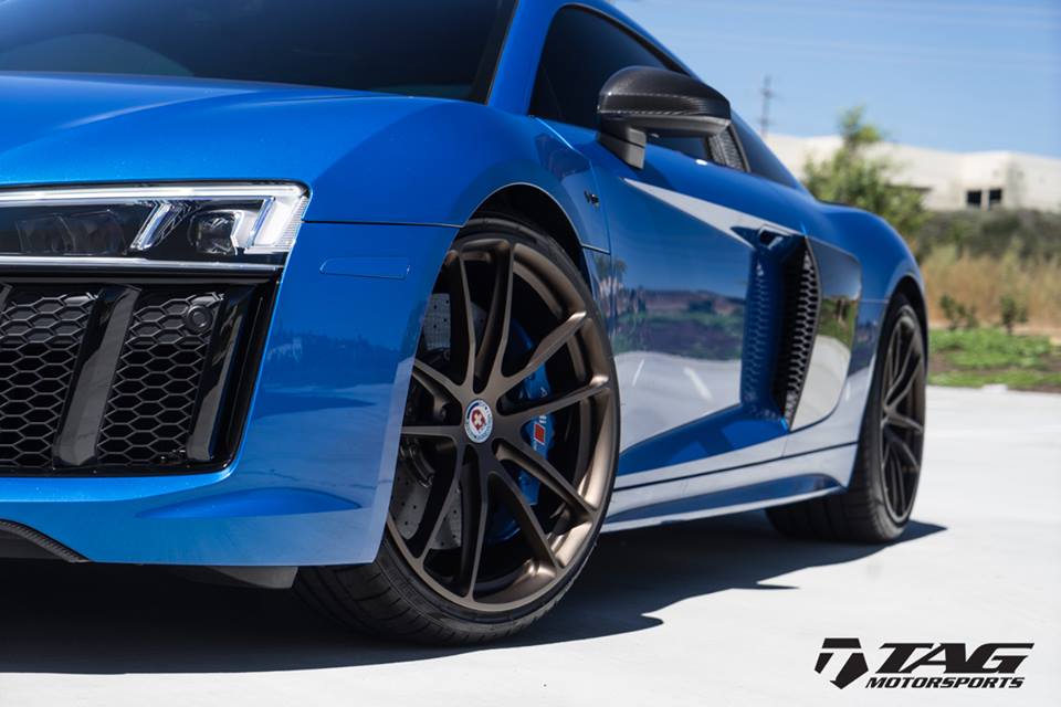 TAG Motorsports Audi R8 remedies the wheel issue by employing a set of really fancy looking HRE wheels (20″ HRE P104 in Satin Bronze) which they have then complemented with some Ara Blue brake calipers. As for the exhaust, they chose one of the best names in the business, Akrapovic with their Evolution Line system. Other little changes TAG has done to this car to make that much cooler include gloss black cosmetic package, XPEL clear bra, and VF Engineering HEXTune ECU tune to 625 hp.