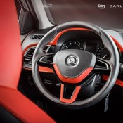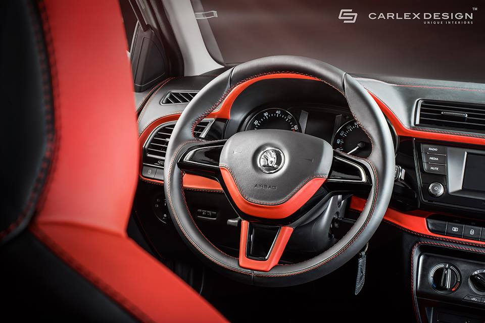 So Carlex Design Skoda Fabia gets a new upholstery in black leather with red stitching, piping, and accents. The same recipe is found on the door cards with a dash of Alcantara, while the consoles and the dashboard get a heavier dose of the red accents. The steering wheel is a particularly fine example of Carlex’s craftsmanship as it features extremely fine black and red leather with contrast stitching and piano black inserts. This thing must be the only Skoda in the world that you would actually want to spend time in.