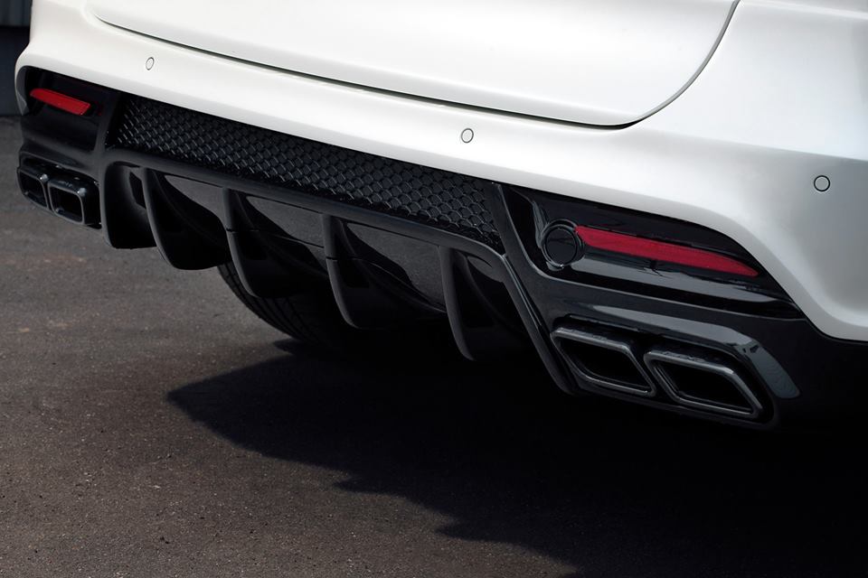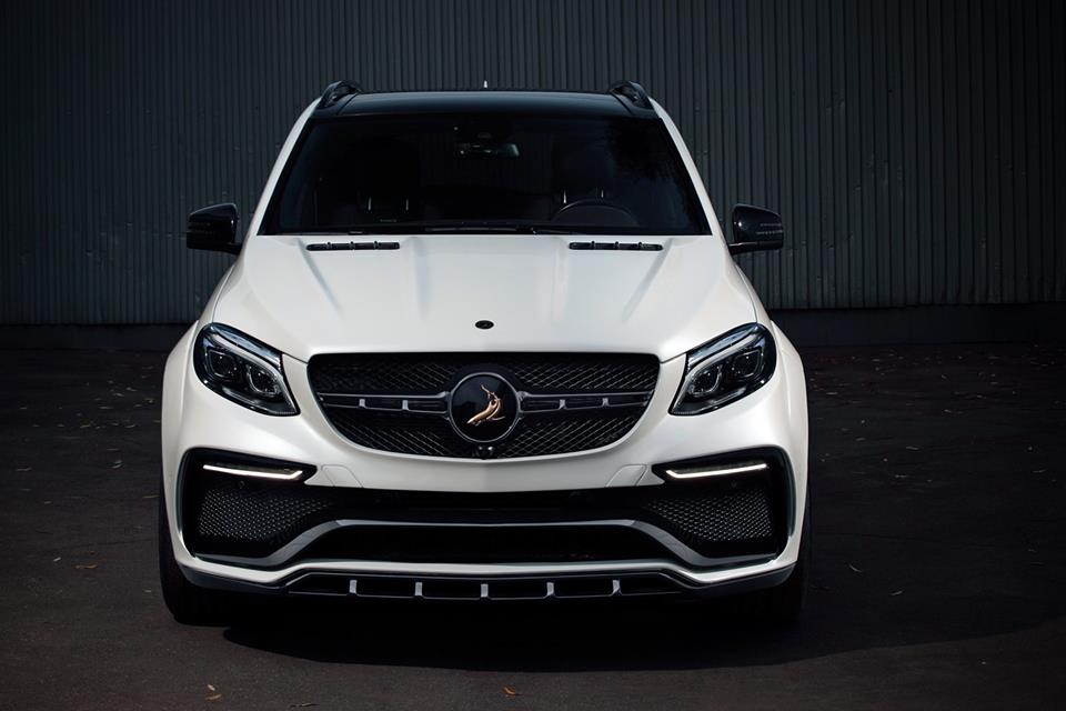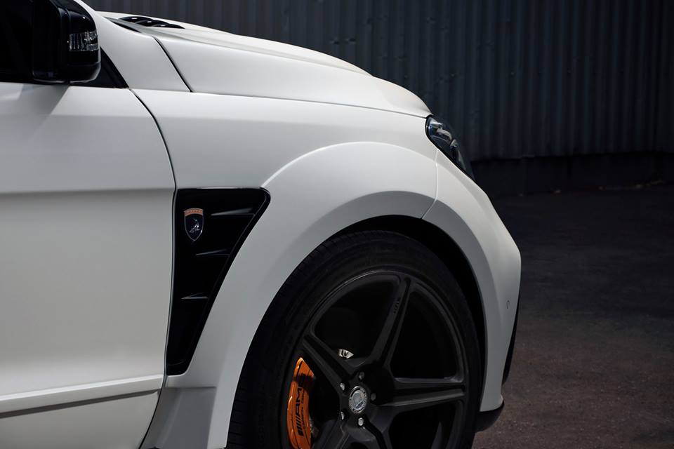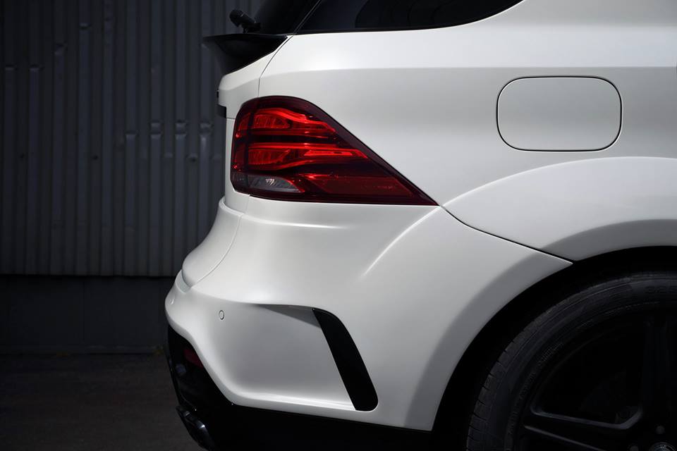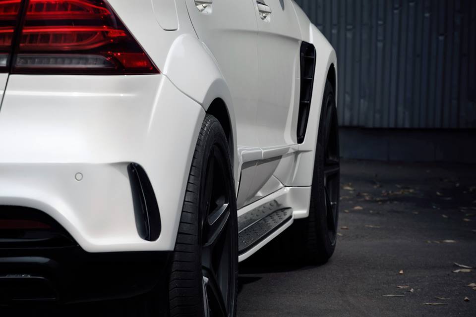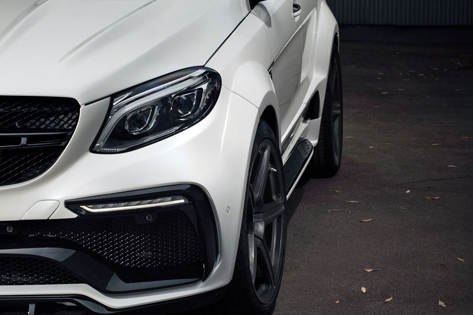 Whether you go for the regular TopCar Mercedes GLE or the Coupe version, the ingredients of the INFERNO package are the same and include front and rear bumpers, front fender extensions with pads, carbon fiber hood, side skirts, pads on front and rear doors, rear fender extensions, rear spoiler. Here the package is shown on a GLE 63 AMG in white where it looks beautifully discreet while giving the car a decidedly aftermarket appearance.