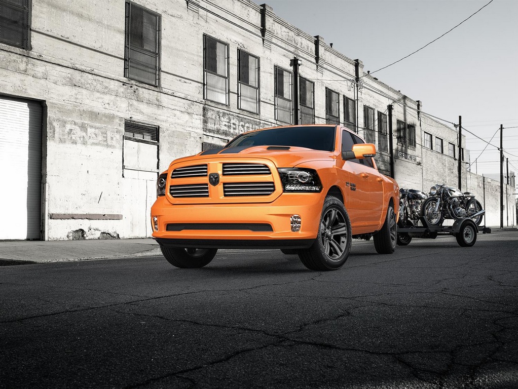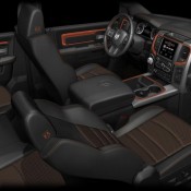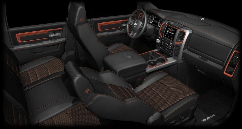 As for the Ram 1500 Ignition Orange, this one has a little more substance, featuring monochromatic exterior hue with body-color grille, Sport performance hood with black decals, black Ram’s head grille badge, black tailgate badge and black body-side badges. Inside, the Ignition gets “Copperhead” accent stitching throughout the cabin, Sport embroidery on the seats, accent-color Ram’s head embroidery on the headrests and colored-accent sport mesh on the seat inserts, as well as Anodized Orange-painted spears and trim rings.