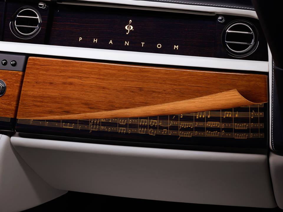 The car does that by boasting a series of musical motifs on various bits of its body. The most prominent feature of the ‘musical’ Rolls-Royce Phantom Drophead is the dashboard Barrel Oak and Dark Heart Ebony veneer with its unique design which at first seems like shoddy build quality as the veneer appears to be peeling off. But that’s supposed to be an artistic effect, revealing beneath it a music sheet.