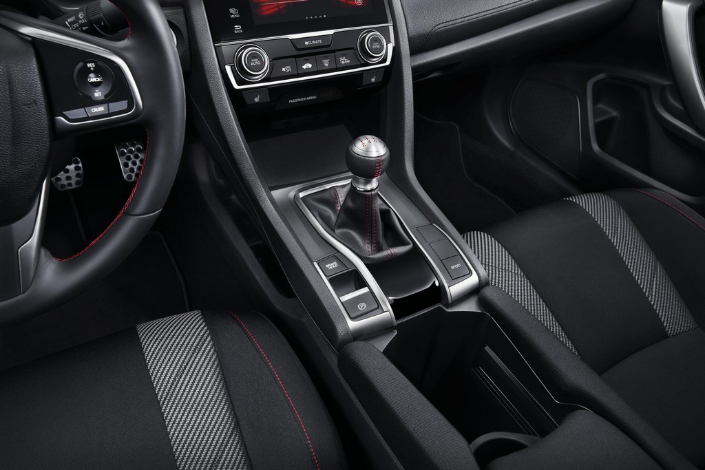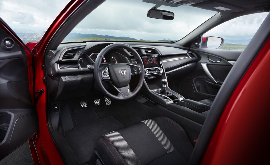 Among the serious performance-mided upgrade made to the 2017 Honda Civic Si Coupe and Sedan we can mention the dual-pinion adaptive electric power steering system with variable ratios, sport-tuned suspension, an adaptive damper system, a helical limited-slip differential, larger 12.3-inch front brake rotors and wider 235/40 R18 tires with a performance tire option. Add to that the spoilers and wings, 18-inch 10-spoke alloy wheels, bolstered front sport seats with red stitching which carries through to the doors, steering wheel and leather shift boot with aluminum shift knob, aluminum sport pedals and Dry Metal Carbon instrument panel trim, and you have a youthful and fun-to-live-with sports car.