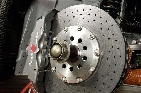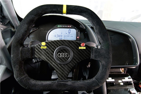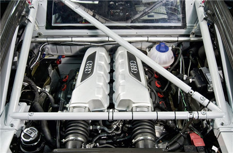The V8 engine in this stripped-out racing R8 develops 500+ hp but because GT3 regulations do not allow AWD, the power goes to rear wheels through a six-speed sequential gearbox. The car weighs 1300kg, a full 300kg lighter than the production R8.