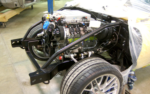 The motor, which Stielow says makes about 511 hp at the rear wheels on a Mustang chassis dyno, sits low in a bolt-on Art Morrison subframe. The transmission is a Tremec T56 transmission from a Viper.