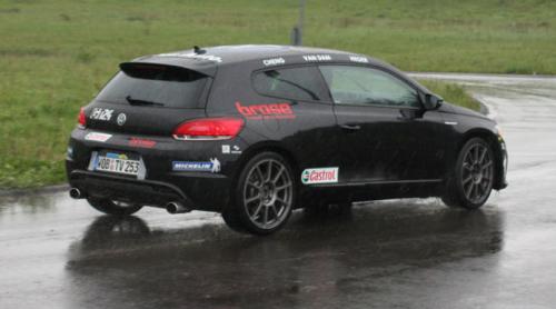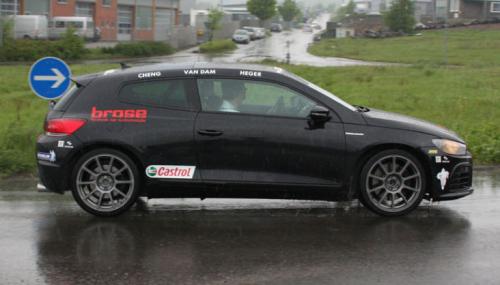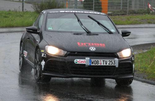The race-prepared hot version of the VW Scirocco called the R20 has been scooped again in black with some stickers on it! The car will debut at 24 hours race of Nurbergring and it seems that VW had no problem finding sponsors for the car! As you know, Scirocco is literally a Golf GTI underneath and this R20 is powered by a 270 hp engine. Quit a recipe then for a class leading performance.