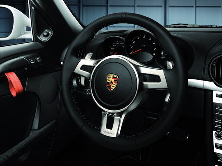Porsche also offers the Turbo’s leather-wrapped three-spoke steering wheel which has paddle shifters for the car’s PDK gearbox behind the wheel, rather than on front like those stupid thumb-shifters. It’s a 940 Euro option and is available for retrofitting on all versions of the 911, Boxster, Cayman, and Panamera with PDK and, starting in August 2010, on the new Cayenne with Tiptronic S.