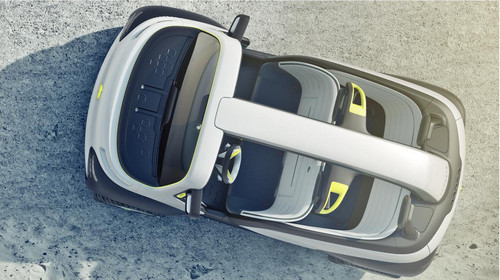 The on-board technology is also of a playful nature, underlining the seeming paradox between design expertise and lightness of tone. Strictly speaking this car has no fixed roof. In its place is a T-shaped structure that extends back to the boot like a “backbone”. With several functions, this structure helps when accessing the vehicle and features an ingenious system that provides shelter for passengers. An auto-inflatable hood deploys all the way along the backbone to form a soft-top roof. In the same yellow as the grab handles, the inflatable roof ensures a light-filled cabin, come rain or shine.