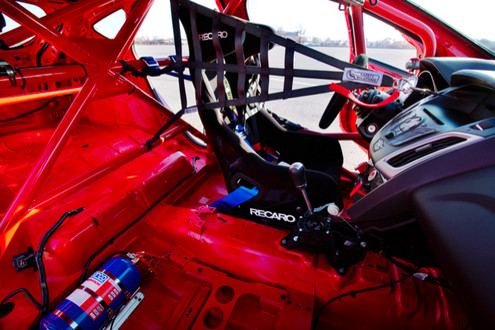 Interior components include a rollcage, a Recaro racing seat, AIM MXL Pista data system and AIM SmartyCam. Ford Racing fire suppression system and Ford Racing six-point safety harness round out the modifications that bring the car from street-spec to race-ready.