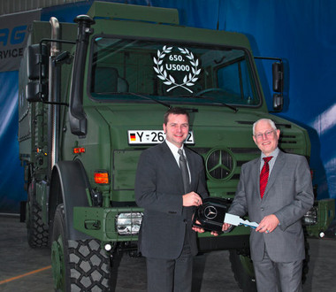 The armed forces vehicle fleet service (BwFPS) took delivery of its 650th Unimog U 5000 right on time as the year comes to a close. The head of procurement at BwFuhrparkService GmbH, Uwe G?nther, accepted the symbolic Unimog U 5000 keys from Michael Diez, head of government sales in the Mercedes-Benz sales organisation for Germany. Unimog deliveries are distributed to the appropriate armed forces locations in Germany and the logistics office via the mobility centres of BwFPS. The Unimog has a long tradition with the armed forces, starting in 1956 with the Unimog S and successfully continuing with tens of thousands of vehicles delivered right up to the present day.