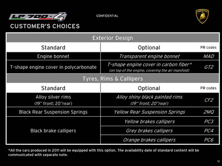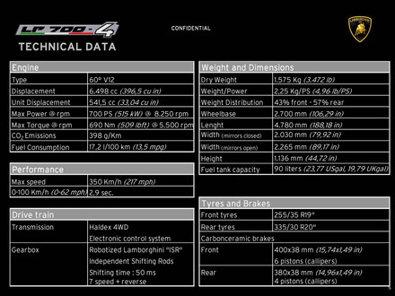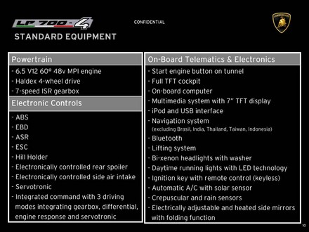Thanks to the leaked ‘confidential’ order guide of the new Lamborghini Aventador LP700-4, we are able to reveal to you the official specs of this hyper car ahead of its debut at the next Geneva Motor Show. So let’s start with the first things everybody wants to know: The Lp700-4 goes from 0 to 100 km/h in 2.9 seconds and keeps on going to 350 km/h.