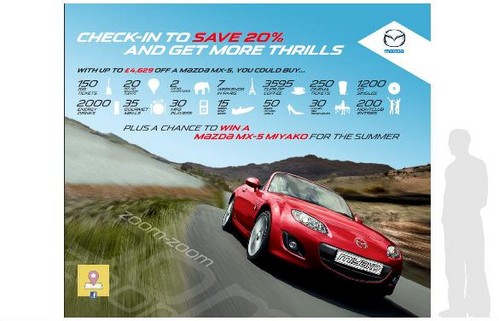 “Facebook Deals recognises the consumer’s appetite for a deal and brings a real financial benefit to social media use. Just by being one of Facebook’s 26 million UK users you are suddenly entitled to some fantastic offers and 20 percent off Mazda’s iconic sports car, a deal you cannot get anywhere else,”