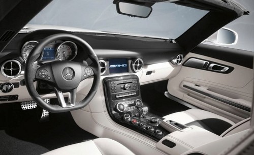 The standard appointments of the Mercedes-Benz SLS AMG Roadster include black designo leather, heated AMG sports seats, a detachable glass windstop, COMAND with Navigation and DVD player, anti-theft alarm system with tow-away protection and interior monitoring, dual-zone automatic climate control and the KEYLESSGO starting function. The standard AIRSCARF® system exclusive to Mercedes-Benz acts like an invisible scarf warming the head and neck areas of the occupants. It is integrated into the backrests of the AMG sports seats, and blows warm air from vents in the head restraints. The airflow can be adapted for different occupant sizes by means of adjustable louvers, and the level of warmth can be selected in three stages at the touch of a button.