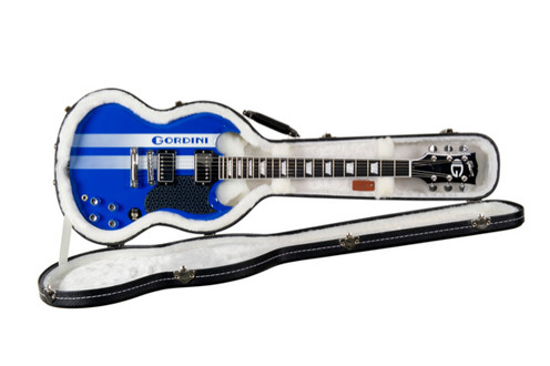 As for the Gordini Guitar, it’s a reissue of the original 1961 SG, and feature Gordini blue and two white stripes plus a Gordini logo on the headstock which tops its ebony neck. Those festival goers who take part in the Gordini guitar solo competition will get a chance to play the guitars and possibly won it based on the number of votes they receive on the web for their playing.
