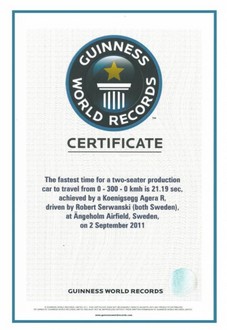 Christian von Koenigsegg and his Agera R officially enter the Guinness World Records book as the fastest car to do zero – to 300km/h – to zero. The Swedish supercar does that in a mind-bending 21.19 seconds. The Agera uses every single one of its V8’s 1115 PS for this amazing performance. The car has also set five other world records, which you can find out about after the jump and after you watched a video of it doing the record run.
