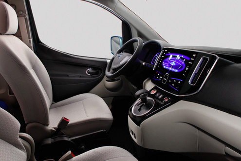 Inside, the Nissan e-NV200 Concept interior depicts a clean, modern Nissan EV identity through use of the EV meters, blue colored accents and bright interior color palette, while also retaining the NV200’s strong functional feeling. The e-NV200 Concept interior also features advanced telematics and a flat C-cluster display that resembles and responds to user input like a tablet computer.