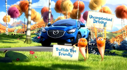 It is actually two commercials in one. Dr. Seuss’ characters help promoting the CX-5 and it then promotes Dr. Seuss’ The Lorax movie.
