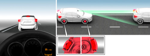 When driving from approximately 4 – 30km/h, a laser sensor mounted at the top of the front windshield glass detects a vehicle or obstacle in front of the car and reduces brake rotor travel to quicken braking when the system calculates that there is a risk of a collision occurring. Next, if the driver fails to perform any avoidance maneuver such as applying the brake, an automatic braking operation is activated. When the speed difference between the driver’s car and the vehicle in front is less than 30km/h, the system is designed to avoid, or mitigate the damage from a collision.