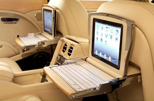 The iPad Specification comes with two electrically-deployed veneered picnic tables for rear passengers, colour-matched to the seats of the Mulsanne, and at the press of a button twin iPads with wireless keyboards are revealed. Both rear passengers can work on documents or files independently, email, browse the internet, make video calls or play music or games. The picnic tables are cleverly designed so that the keyboards can be easily removed and placed on the user’s lap for added comfort.