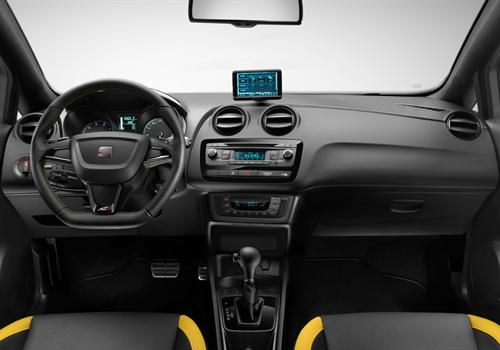 At the Beijing Auto Show today Spanish car maker SEAT unveiled a new concept version of the Ibiza Cupra. Presented as a close-to-production concept car, this Ibiza is basically a souped up version of the current version with more dramatic styling. The sport theme continues inside with two-tone black and yellow upholstery and a flat-bottomed steering wheel.