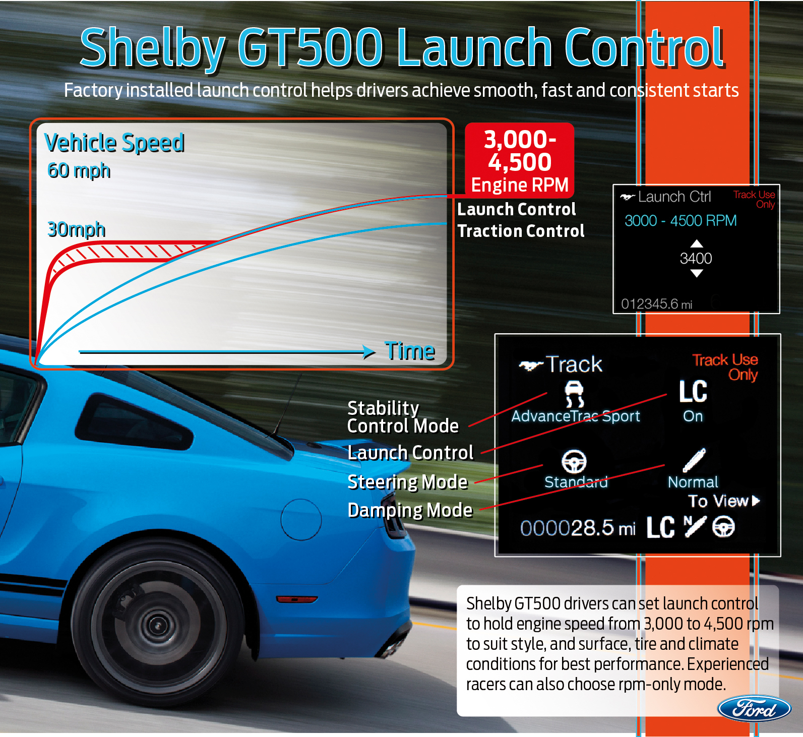 “We recognize not every driver has the same style, and surface, tire and climate conditions vary,” said Eddie Khan, SVT Engineering supervisor. “Most of our competitors’ launch control systems have a fixed engine launch speed. We’ve given Shelby GT500 drivers the ability to adjust the engine speed to achieve best and most consistent performance, no matter where and when they drive.”