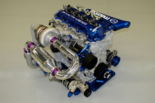 The engines will be based on the stock-block 2.2-liter diesel four-cylinder SKYACTIV diesel units found in the production models. They’re developed jointly by Mazda Motor Corporation, Mazda North American Operations and SpeedSource Engineering and are currently in Dyno testing phase. On track testing will begin in late 2012.These engines are perfect for Grand-Am’s Class for advanced/clean technologies, but not sure if they’re actually fun for road racing. But we’ll see.
