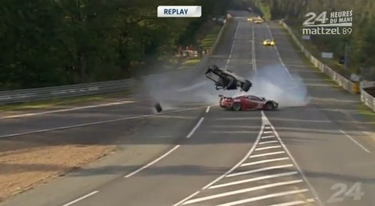 Tough luck for Toyota at this year’s Le Mans 24 Hours. One of their TS030 hybrid race cars driven by young Brit Anthony Davidson was wrecked after a wild crash. The accident happened when Davidson tried to take a Ferrari 458 Italia driven by Perrazini on the inside. The Ferrari driver didn’t notice the big Toyota behind him, took the line, and hit it. The collision sent the Toyota airborne. After rolling spectacularly in the air, the car hit the ground hard and was stopped by the tire wall at the side of the track.