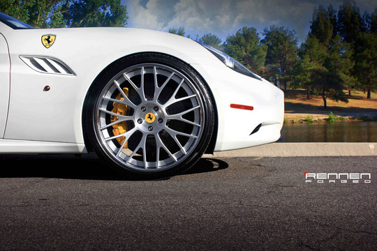 Here’s some eye candy for you to begin the morning with! It’s a pearl while 2012 Ferrari California rocking a set of Rennen Forged Concave wheels with brushed face and color matched white windows, and Ferrari center caps. The wheels measure at 22-inch rear, 21-inch front, and yes, they look a bit oversized at the back, but the overall image is pretty cool. We also dig the design of the wheels.