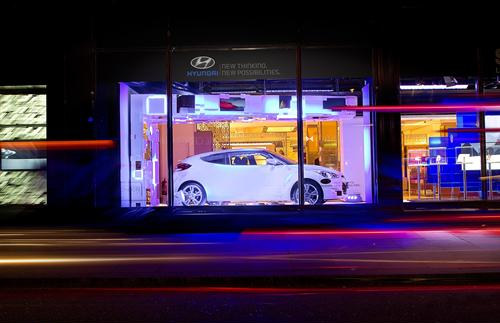 Following footsteps of many other car makers, Hyundai rented a seemingly expensive shop at Harrods, Knightsbridge, to put the new Veloster on display until August 25. Aside the car, the window display includes the Hyundai Veloster, robots, interactive screens and automated home appliances.