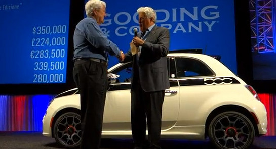 About a week ago at the Pebble beach Concours, and through Gooding & Co auction, Jay Leno auctioned off his special Fiat 500 Prima Edizione (chassis number 2), to benefit Fisher House, a charity that provides housing for families of wounded vets. Now Jay’s garage has released a video of the event, attended by Leon Panetta and Army Chief of Staff Ray Odiero.