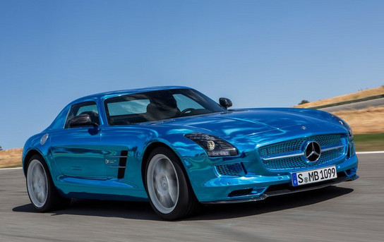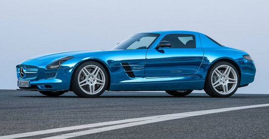 This chrome blue Mercedes SLS you see here is not a badly tuned version of the German super car. It is the SLS AMG Coupe Electric Drive, a full electric variant of the mighty SLS, set for market launch in 2013. Now, apart from the color, this is our kind of electric car. It has four meaty electric motors, which make a total 552 kW and a maximum torque of 1000 Nm; It does zero to 100 km/h in 3.9 seconds; and it costs 416,500 EUR!