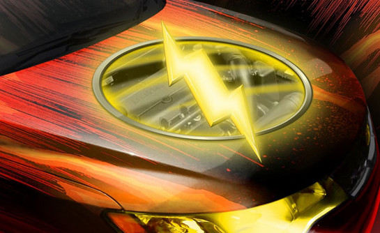 Earlier this month Kia revealed Batman-themed Optima and announced its partnership with DC Entertainment for “We Can Be Heroes” giving campaign. They will be showing eight customized cars at this year’s SEMA show to promote the Campaign, which fights hunger in the Horn of Africa. Now they released a teaser of the second SEMA-bound car, a flash themed Kia Koup. Not much is known about the specs of the car, othe than the fact that is has a big whole in its bonnet and a lightning bolt. So look for it on the show floor. Not that you can miss it.