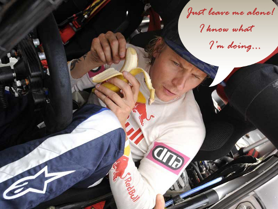 Just check out the video of the radio convo with his team, and enjoy the graphic we created to illustrate it. We know Kimi’s not rallying with Red Bull anymore, but this is the perfect photo to make some fun with the situation.