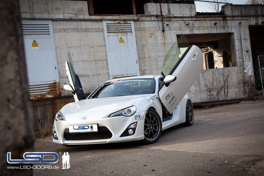 Presented at the Essen Motor Show, Lamborghini style doors hinges are tailor mad for this Toyota to match the original mounting points and provide accurate fit. They have German TUV quality certificate. LSD doors for the GT86 even comes with gas springs to cope with the weight of the doors.