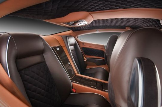 For this Bentley Vilner has gone for chocolaty theme, with dark brown leather on the seats and the roof liner, a slightly brighter one for the pillars and middle part of the roof, and a sort of creamy colored leather and Alcantara for the door panels and dashboard.