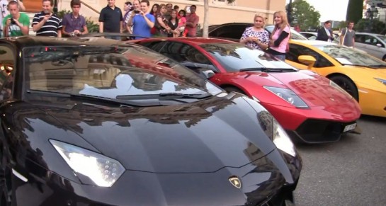 The Aventadors in this footage, courtesy of Marchettino, are black (Nero Aldebaran), matte black (Nero Nemesis), white (Bianco Isis), matte white (Bianco Canopus) and yellow (Giallo Orion).