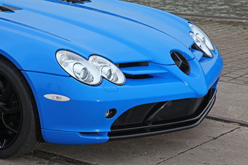 The SLR is starting to look old, even though it is still one of the fastest and most fun supercars in the world. So they came up with this treatment to give the old gal a fresh new look. Complementing the blue wrap of the body panels are the gloss black bits, featured on side mirrors, side vents, and parts of the bumpers. The wheels are also finished in black.