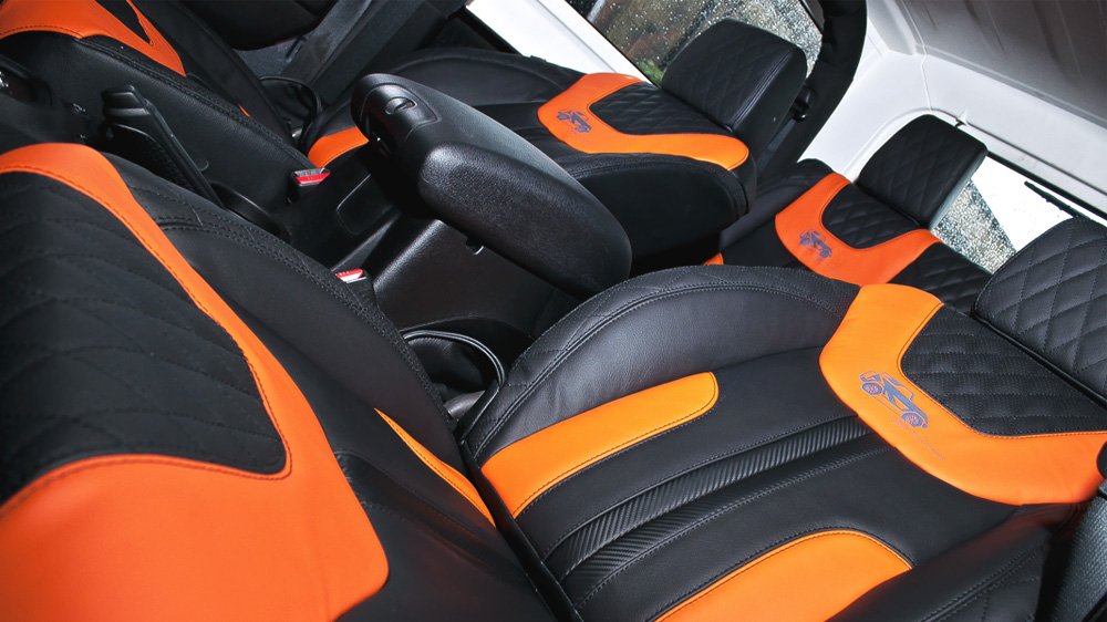 Even though the interior treatment is bespoke to each customer, these particular cars here are fitted with front and rear seats in black leather with orange inserts and carbon fibre centre stripe, dashboard centre console in body colour, mud flaps (toughened rubber) set of 4, speedo and rev counter facia in orange and gear shifters wrapped in orange.