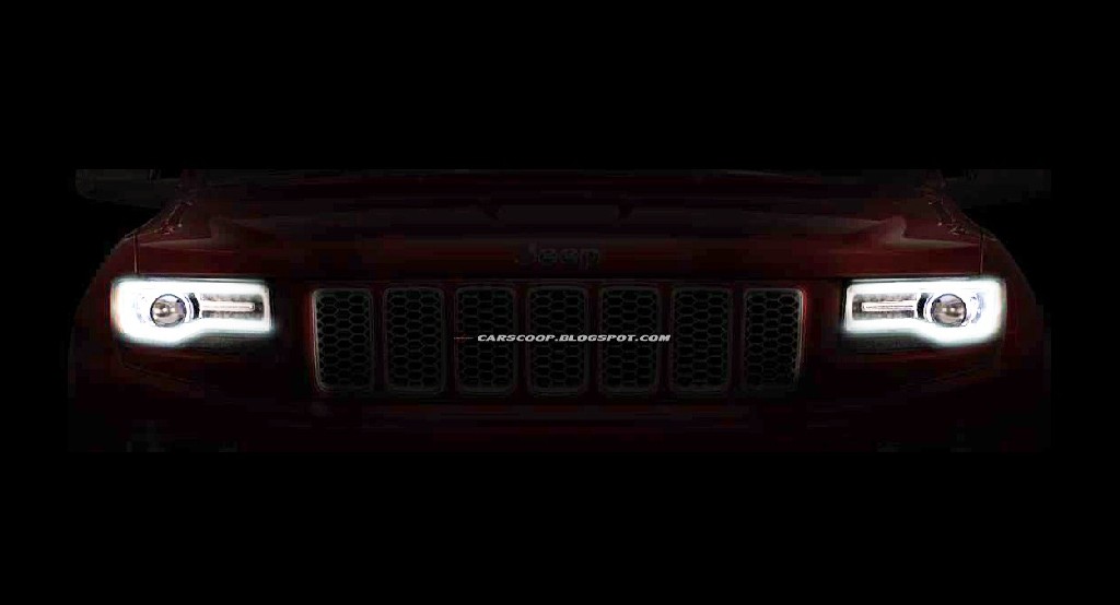 The image above is the first teaser shot (enhanced by the folks over at CarScoop) of the new Jeep, even though at first glance it appears to be a Chrysler 300. But if you look closer you notice it has a seven-slot grille, which is Jeep’s signature dish.