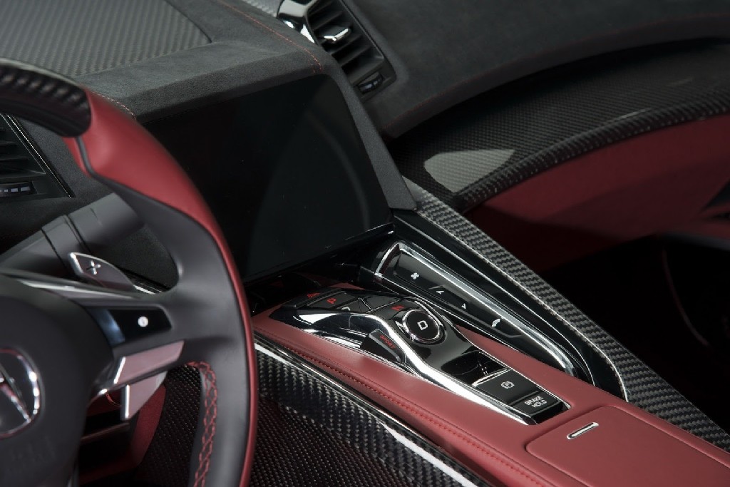 The NSX boasts an interior, which as we mentioned before, looks kind of like the cabin of Lexus LFA. It has a similar tall center console with a large screen at the top, a chiseled and sporty steering wheel, and tons of leather adorning pretty much everything you see and touch. Carbon fiber and Alcantara are among other exotic materials you find here.