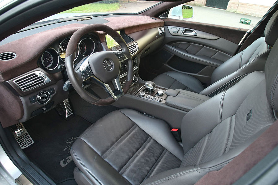 Save the 20-inch Carlsson 1/10 wheels, lowered ride height, and a few aero parts such as a front spoiler lip, more prominent rear diffuser, and new round tailpipes, the RSR looks pretty much like the standard CLS63. Same goes for the interior. You get some new leather and Alcantara, aluminum pedals, and special floor mats, but there is no clue on what a monster this car really is.